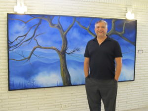 (Art Forum co-owner/director, Arturo Huron stands in front of painting by Shawn Knuckles | photo: Jenuine Poetess)
