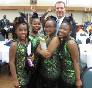 Four dancers from Miriam’s Army visit with School Board President, Pat Atkins. (Photo bombing mom in the background!)