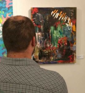 Photo: Austin Meek looks at “Sleep Painting: Bach,” by Travis Tarver, at the Waco 52 exhibition.