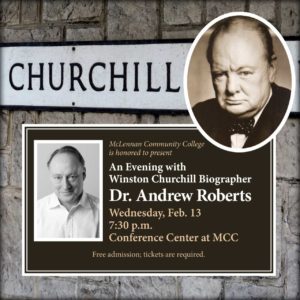 “An Evening with Sir Winston Churchill Biographer Andrew Roberts” will be held on Feb. 13 at 7:30 p.m. in the McLennan Community College Conference Center. Admission is free to the public, but tickets must be reserved at www.mclennan.edu/andrewroberts. Copies of Walking with Destiny will be available for purchase at the event.