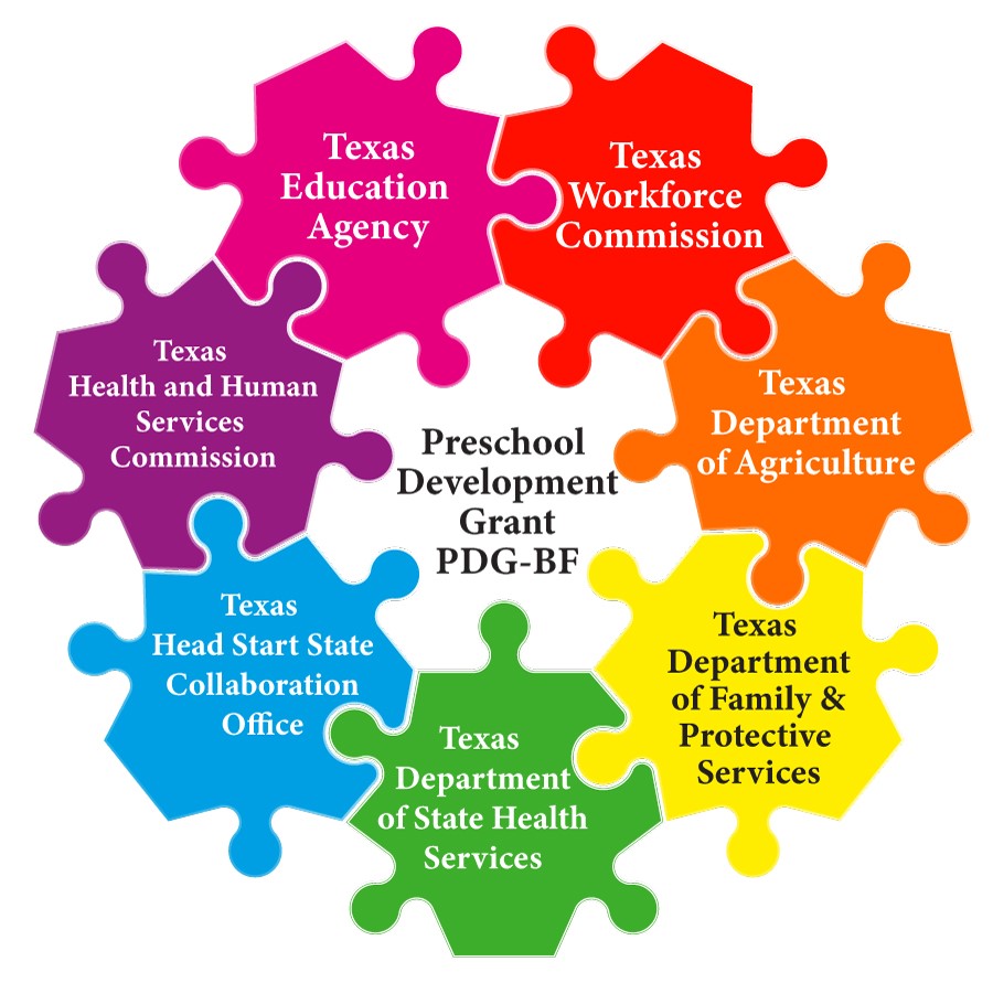 Below are the seven state agencies involved with PDG B-5 and are tasked with coordinating their services, streamlining their infrastructure, and improving the quality and availability of early care and education services.
