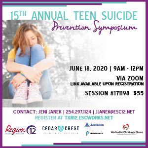 The Symposium, which normally is held at ESC Region 12 in Waco, will be held virtually through Zoom. Participants will have access to the Zoom link upon completion of their registration. The event format, though shorter, will be engaging and offer an online break-out to discuss the content and have breaks with the speakers. Medical and mental health speakers will share research and strategies for helping youth who struggle with suicidal ideation.