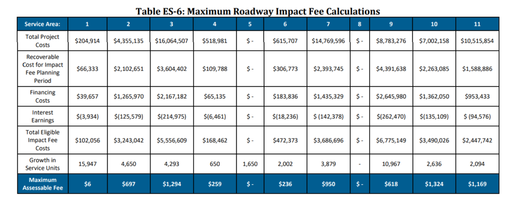 Here we see that after all these steps the maximum impact fee allowable by law for roads in service area one is $6 and for service area eleven is $1,169. These numbers are the final product of that could process we discussed at the very beginning of all of this. That is the process to determine what impact fees could be (as opposed to should be).  Whatever the outcome of the should process is, the impact fees cannot exceed these amounts for a single-family residence equivalent.