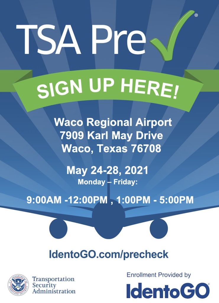 Residents of Waco will be able to enroll in the Transportation Security Administration’s popular TSA PreCheck program at Waco Regional Airport May 24-28.