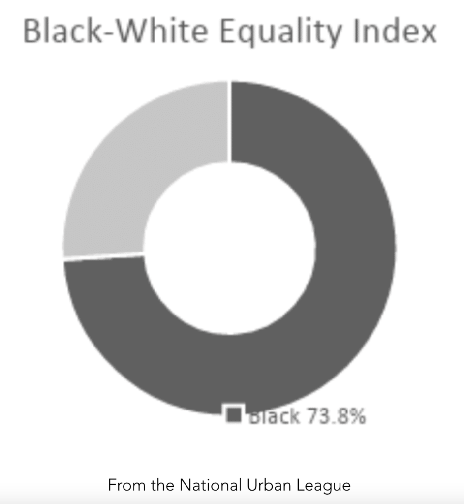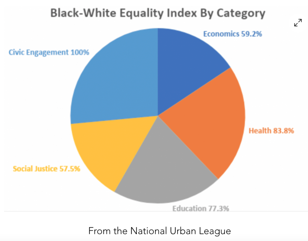 The National Urban League’s “2020 State of Black America: Unmasked” report, shows a Black-Equality Index of 73.8 indicating Black Americans are missing 26% of the pie. The same index shows Hispanic Americans at 78.8 indicating they are missing 21% of the pie.