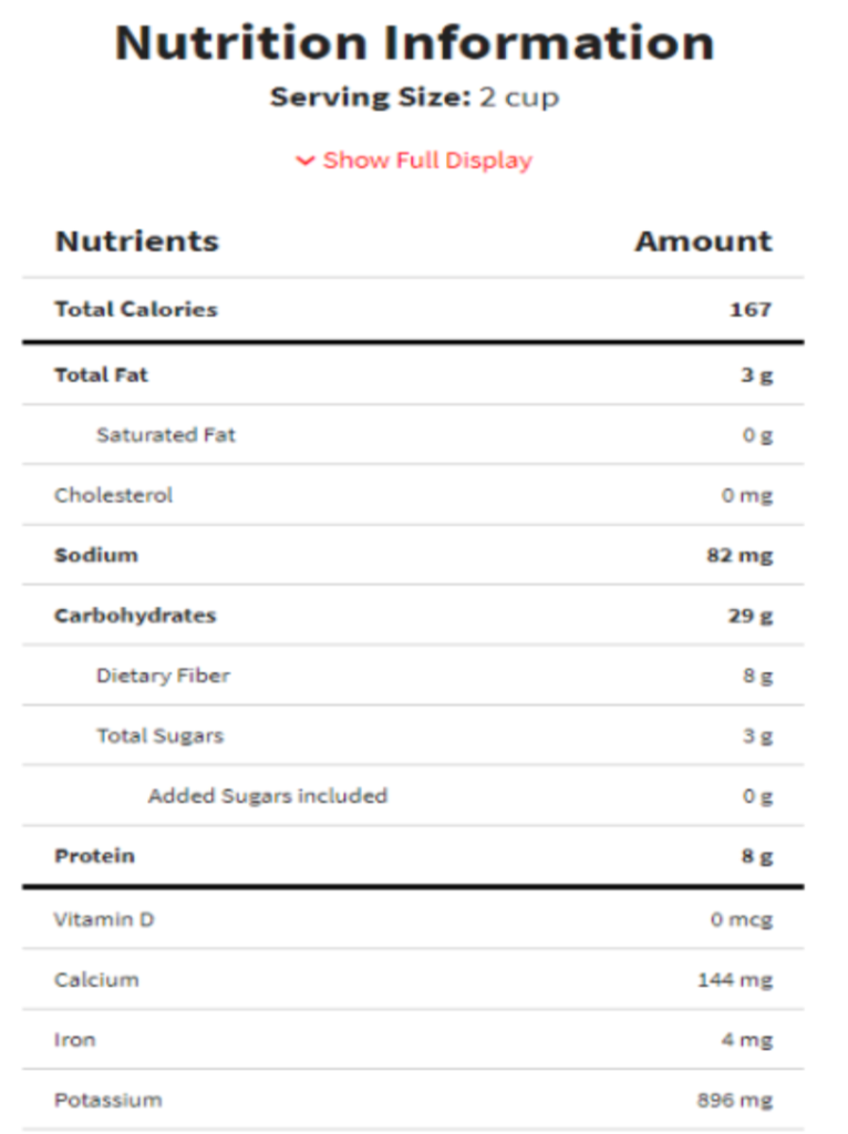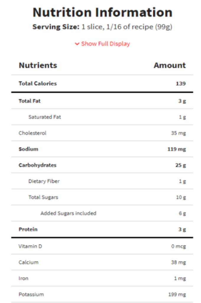 Per serving: Cal. 130, Fat 6g (9%DV), Sat. Fat. 3.5g (18%DV), Sod. 90mg (4%DV), Carb. 18g (6% DV), Sugar 11g, Pro. 2g