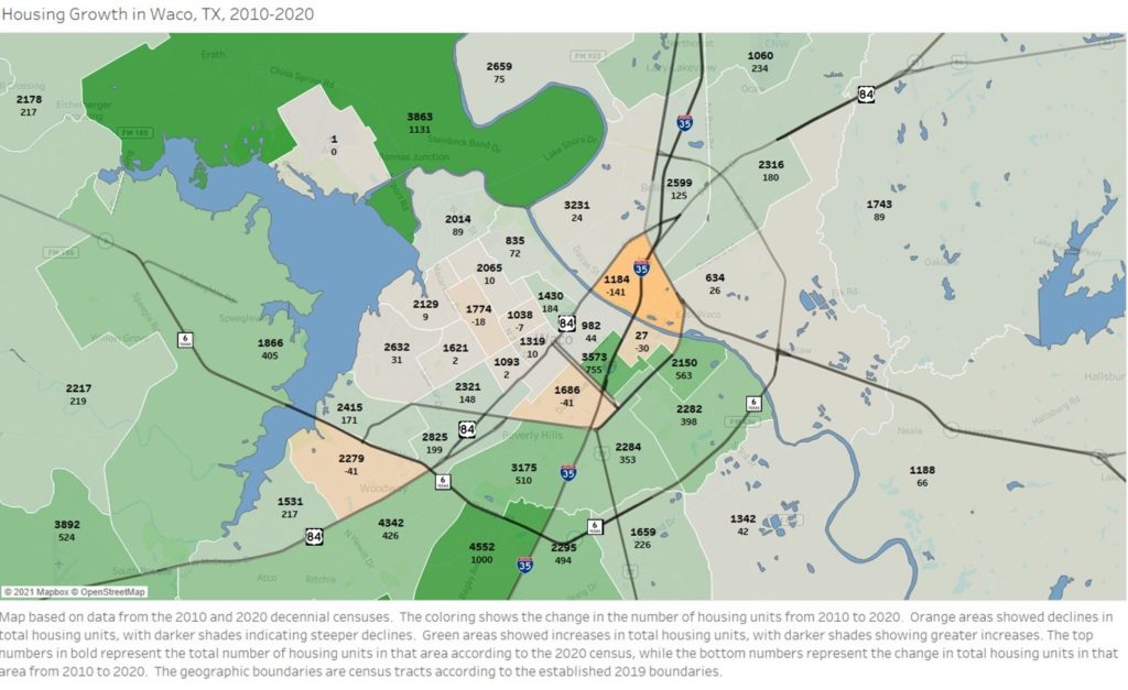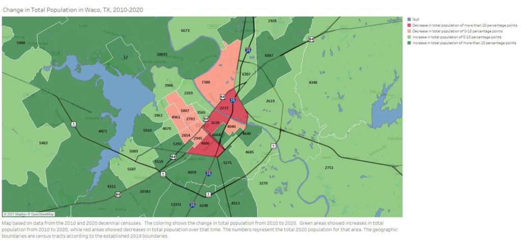 The map shows where we saw growth and decline in McLennan County from 2010-2020. The coloring shows the change in total population. Green areas showed increases in total population, while red areas showed decreases. The numbers represent the total 2020 population for that area. The geographic boundaries are census tracts according to the established 2019 boundaries.