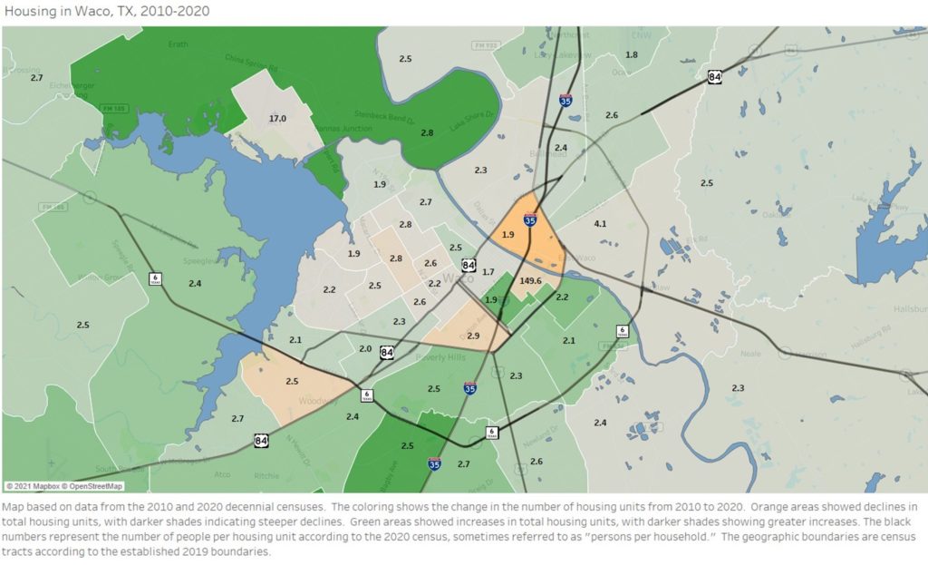 The second map is similar to the first. The coloring is the same, with green shades indicating growth in housing units since 2010, and orange shades indicating decline in housing units since 2010. The black number in each tract is different in this map; it displays the number of residents per household in that area. Most of the county has between two and three people per household. Notable exceptions include downtown Waco and historic East Waco, where there are fewer than two residents per housing unit.